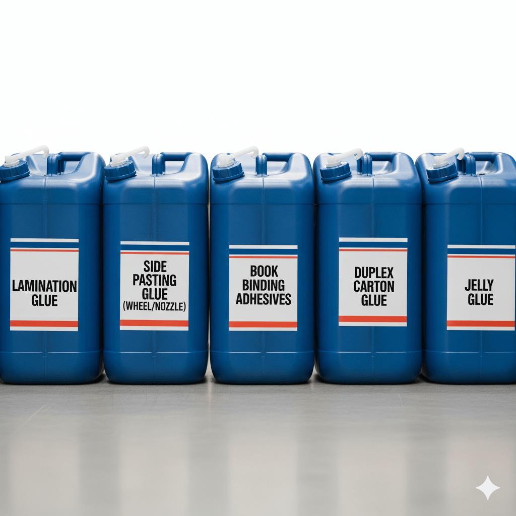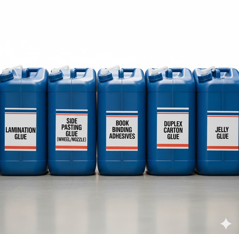 Adhesives used for laminating various materials like : Lamination Glue , Side Pasting Glue (Wheel/Nozzle), Book Binding Adhesives ,Duplex Carton Glue & Jelly Glue
