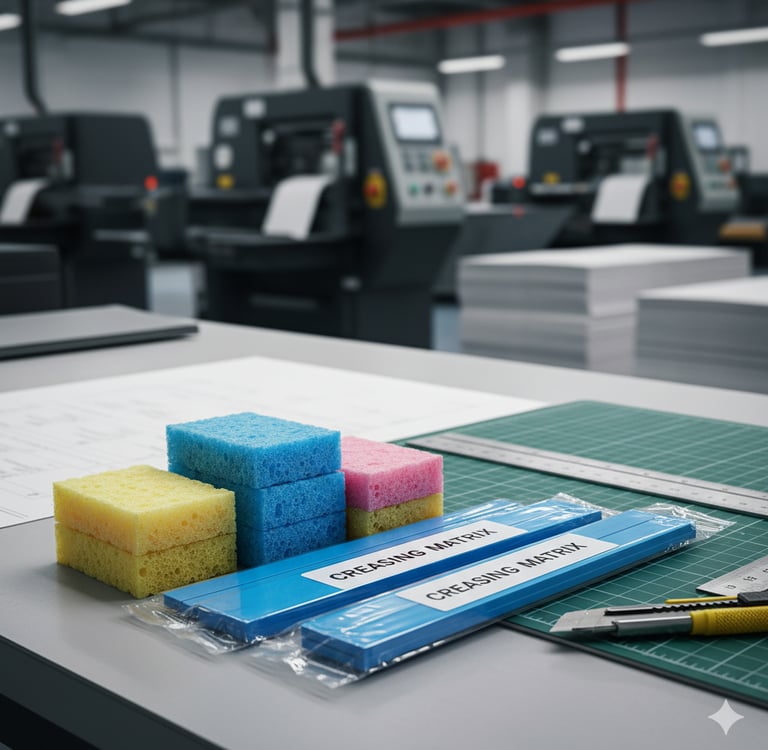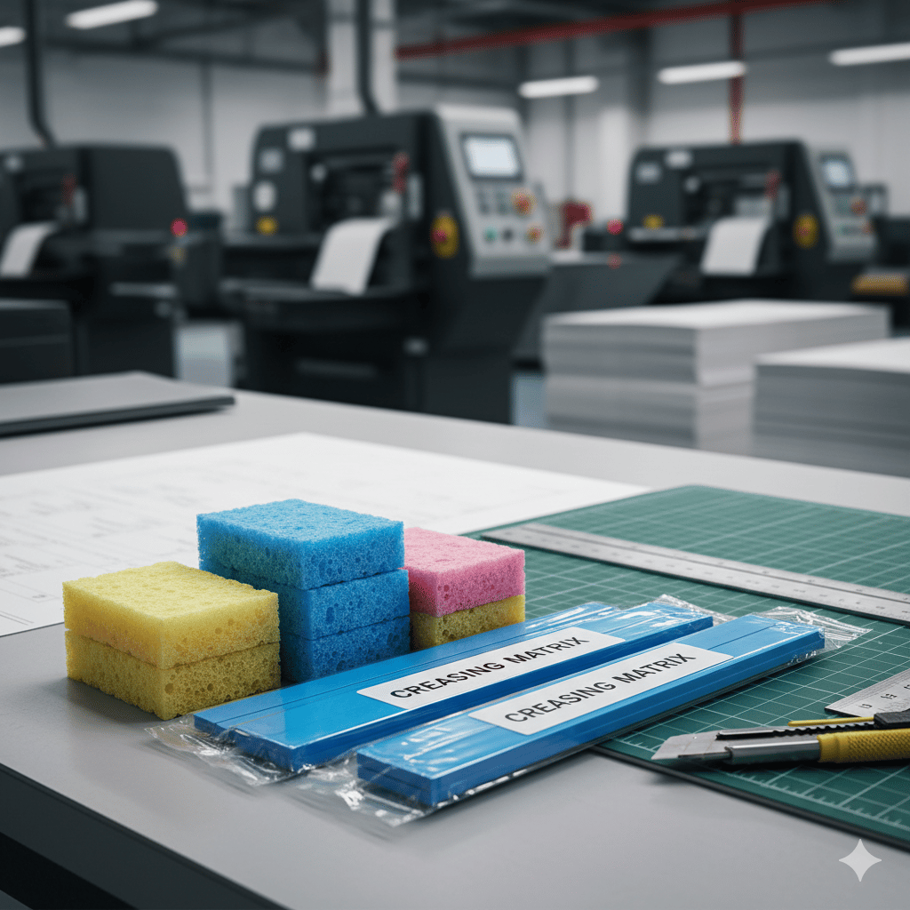 Sponges are used in the printing process, while creasing matrices are used to create precise folds in paper and cardboard for packaging.